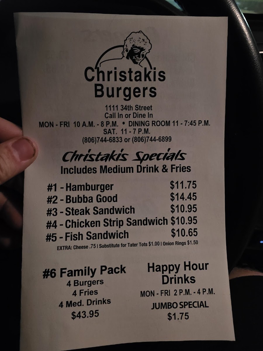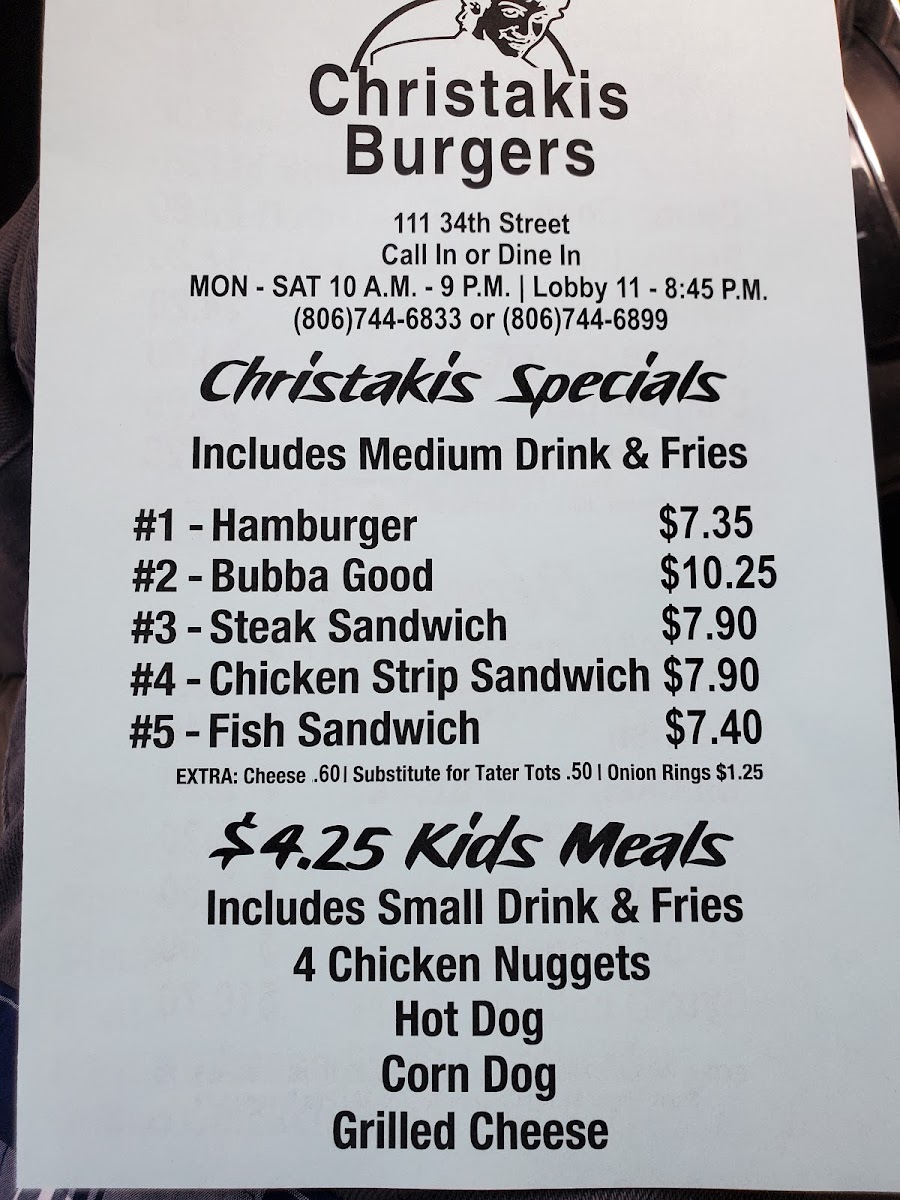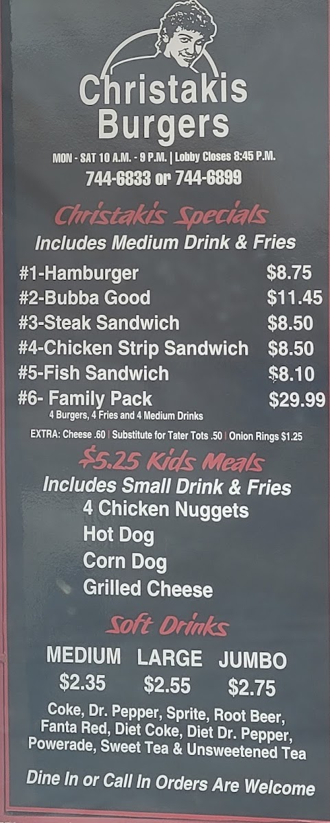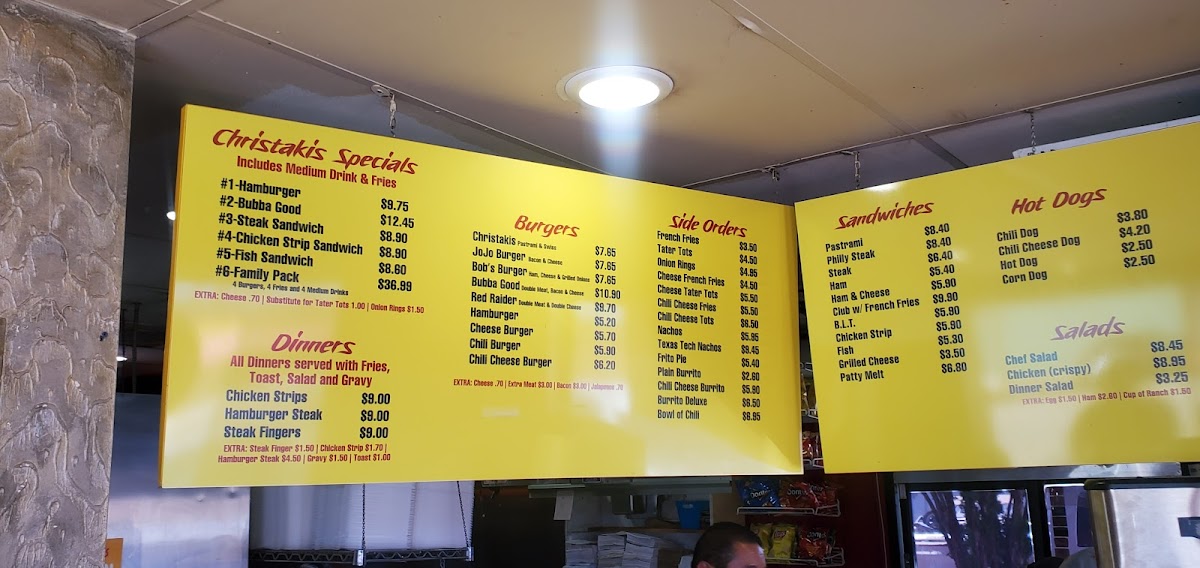 The menu at Christakis Burgers offers a variety of options centered around classic American fast food and casual dining. It features a selection of hamburgers and sandwiches, including specialties like the Christakis Burger, Bacon Burger, Gyro Sandwich, and Philly Cheese Steak. Customers can also choose from dinner plates such as Catfish, Chicken Fried Steak, Steak Fingers, and Gyro Platters.