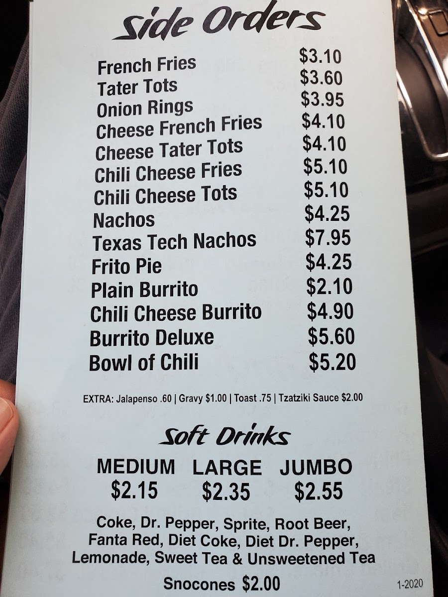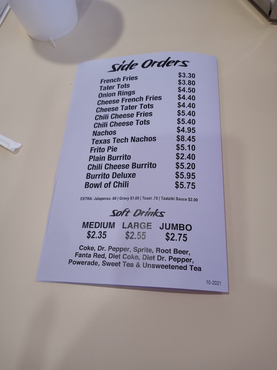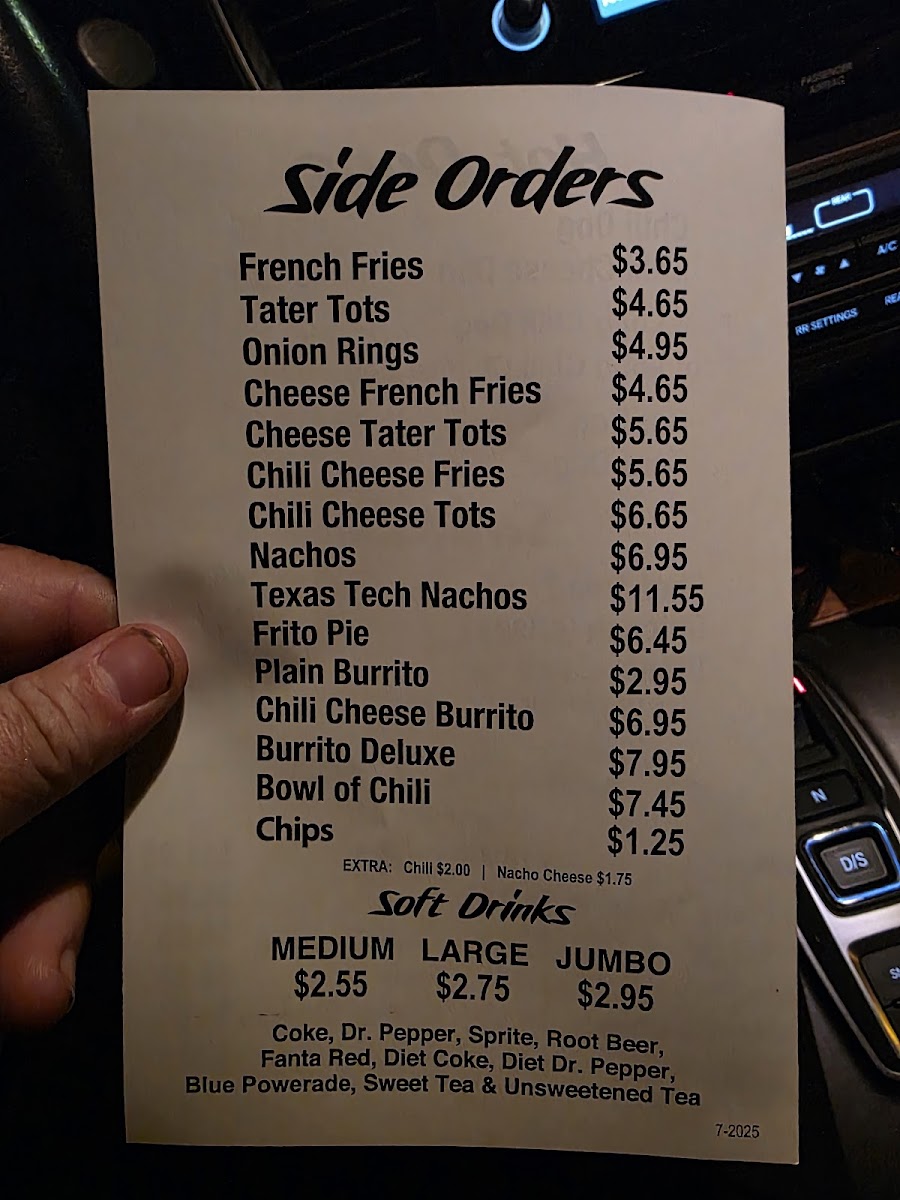 - Sides: Choices such as Fries, Chili Cheese Fries, Onion Rings, Sweet Potato Tots, and Chili Cheese Dog.